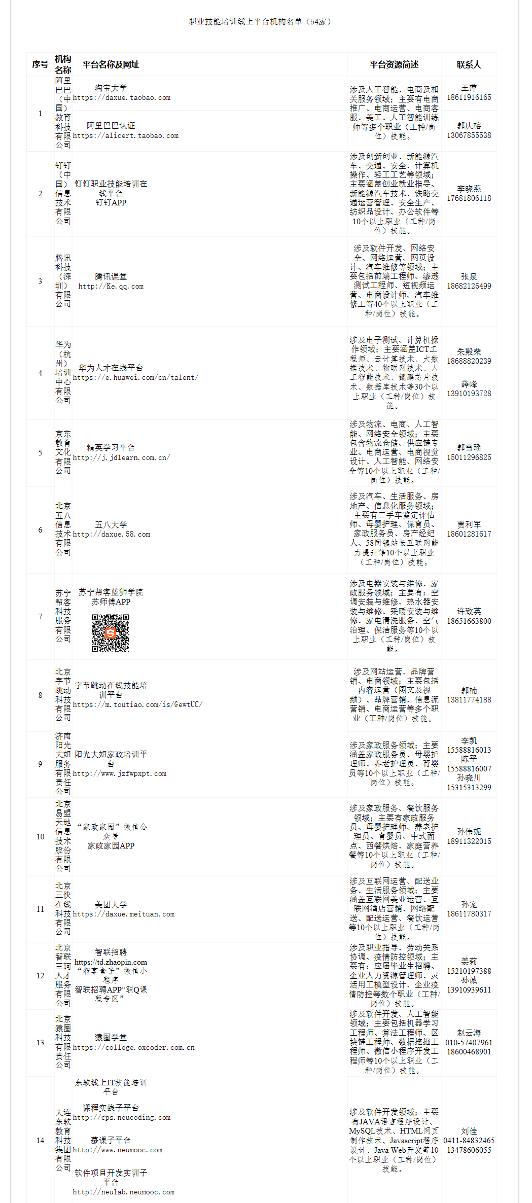 为贯彻落实党中央、国务院决策部署,深入实施职业技能提升行动“互联网+职业技能培训计划”,人力资源社会保障部近日推荐54家线上平台机构,在新冠肺炎疫情防控工作期间免费提供线上职业技能培训资源及服务。 | 来源:国家人社部官网 人社部