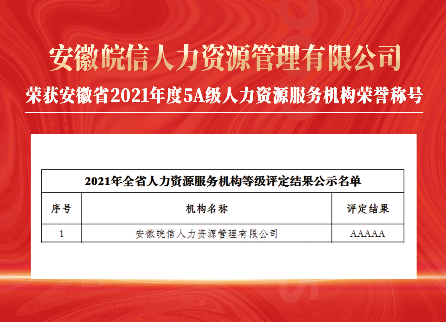 历经县、市、省三轮长达三个月的评比。在2021年12月17日安徽省人力资源社会保障厅发布的《2021年全省人力资源服务机构等级评定结果公示名单》中,安徽皖信人力资源管理有限公司荣获“AAAAA”级服务机构荣誉称号。(公示如下图)